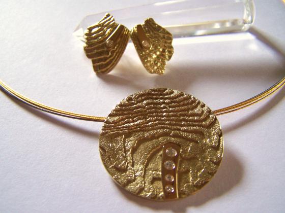 Collier-Mittelteil und Ohrstecker im Sepiaguss aus Kunden-Altgold und kundeneigenen Brillanten...