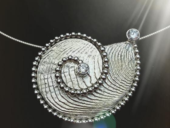 Wunderschöner, großer Schnecken-Anhänger aus Silber im Sepia-Guss mit Zirkonia mittig und am oberen Ende rechts im Bild.