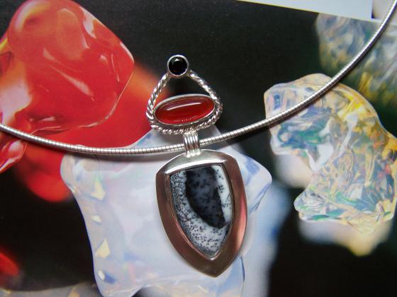 Atlantis-Anhänger aus 925 Silber geschmiedet. Dendrit-Opal, Karneol und schwarzer Spinell