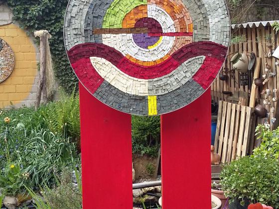 Diese Stele besteht aus einem farbenfrohen runden Mosaik-Mittelteil (D= 60 cm) und ist auf zwei rote Holzbohlen (Höhe 2 m) montiert, die bootslackiert sind und so jede Jahreszeit mit jedem Wetter gut überstehen.