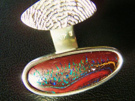 hier ein wunderbarer "Doppelkopf-"Ring aus Silber 925, mit großem, farbenfrohen Boulder-Opal auf der einen Seite und Silber im Sepiaguss auf der anderen