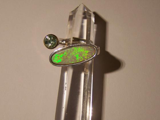 Dieser Silberring besticht durch außergewöhnliche Form genauso, wie durch den wunderbaren grün-blau-rötlich schillernden Opal... Der kleine hellgrüne Prehnit wurde in Gold 585 gefasst und setzt dem Ganzen das Krönchen auf...