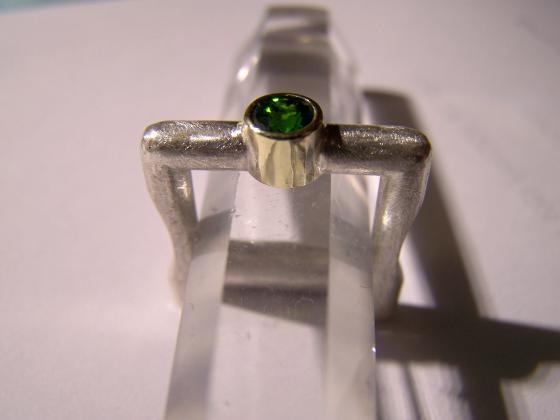 Dieser außergewöhnliche Silberring hat eine quadratische Ringschiene, die an den Fingerinnenseiten etwas "ausgespart" wurde, um ein bequemes Tragen diesen feinen Stückes zu ermöglichen. Dieses Ring-Beispiel zeigt einen Silberring mit Diamantfeilung und einen, in 750 Gelbgold gefassten wunderschön grünen Chromdiopsid...