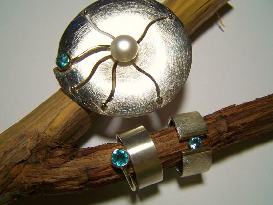 Passend hierzu erhalten Sie die "Brosche 003" die ebenfalls aus Silber, Gold 585 mit Apatit und zusätzlich einer Süßwasserperle gearbeitet wurde... diese "Brosche" kann auch als ANHÄNGER getragen werden...