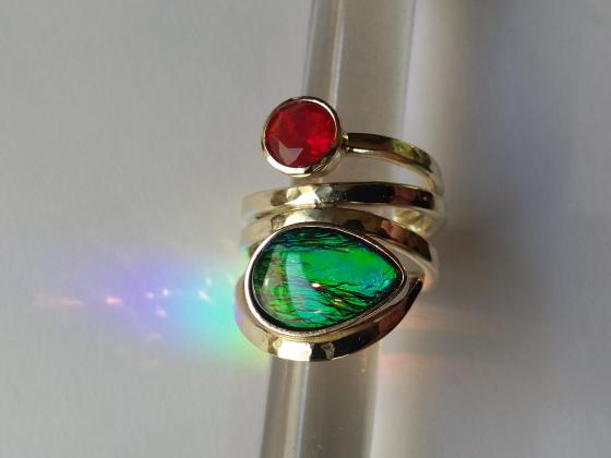 Kundenanfertigung aus Kunden-Altgold: Ringschiene "gewickelt" mit gehämmerter Oberfläche, je ein Ammolith/Korith und ein Feuerachat...