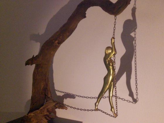 figürliche Darstellung aus Messing handziseliert mit Messingkette an Naturfundholz...